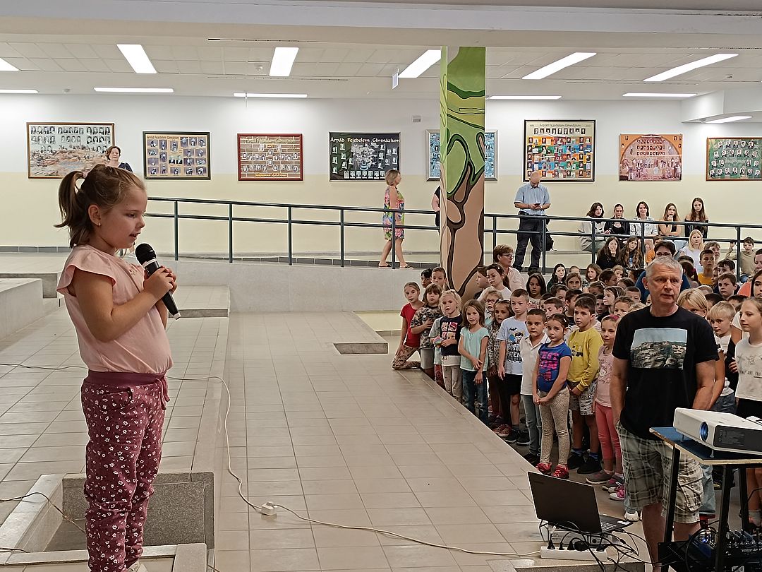 Dalolni szerető diákjaink ma megtöltötték az aulát. Mindannyiunk nagy örömére zengett a dal az október 1-jei zenei világnap alkalmából. A legkisebbeket Jávor Málna, 1.a osztályos képviselte, aki szólót énekelt, majd a nagyobbak is bekapcsolódtak a jó hangulatú közös éneklésbe.